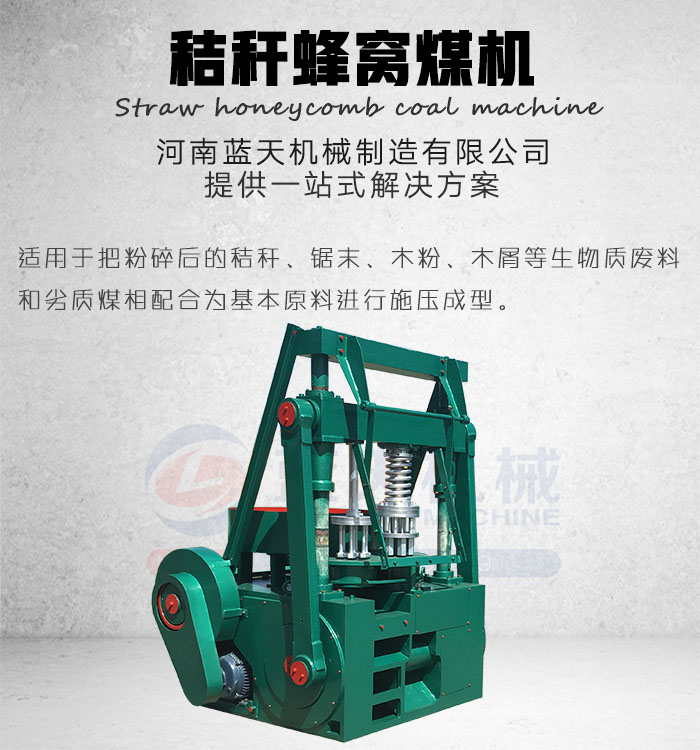 河南藍天機械制造有限公司生產(chǎn)的秸稈蜂窩煤機可根據(jù)各個地區(qū)的煤質(zhì)和燃煤習(xí)慣不同,為用戶提供不同的孔徑、孔數(shù)、煤球外徑、動力等技術(shù)參數(shù)設(shè)計特殊規(guī)格的成型模具。為準用戶單獨規(guī)劃、設(shè)計、生產(chǎn)、安裝秸稈蜂窩煤機流水線,秸稈煤、易燃煤的配方與技術(shù),咨詢秸稈蜂窩煤機價格可撥打熱線: