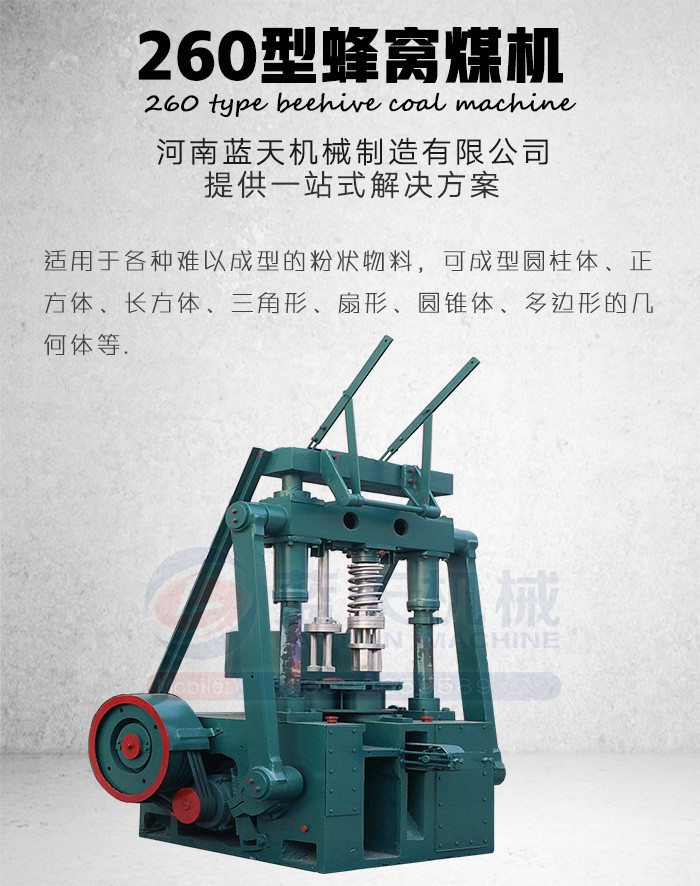 260型蜂窩煤機是藍天機械自行開發的全自動粉狀物料成型設備,主要用于壓制難以成型的粉狀物料,如潔凈煤、清潔煤、蘭炭、燒烤碳、易燃炭以及有色金屬行業的粉料,耐材行業的粉料,電子行業陶瓷粉等物料。廣泛應用于新能源、燒烤、取暖、飯店、運輸、冶金、建材、耐材、化工、電力等行業。