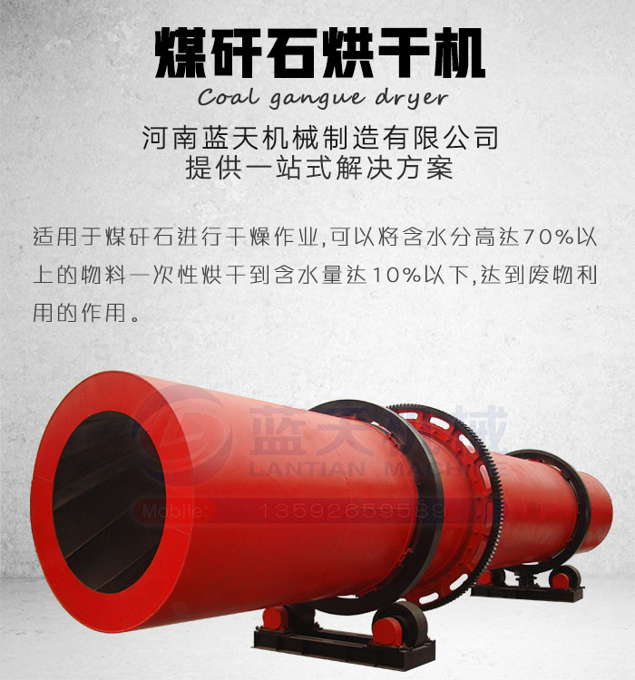 煤矸石是采煤過程和洗煤過程中排放的固體廢物,作為礦業固體廢物的一種,煤矸石棄置不用,占用大片土地,而煤矸石烘干機的出現可將其“變廢為寶”,使其產生巨大的利用價值。河南藍天機械制造有限公司生產的煤矸石烘干機對煤矸石烘干有很好的效果,以其熱效率高、生產能力大、使用壽命長等優勢被國內外用戶所喜愛。煤矸石是采煤過程和洗煤過程中排放的固體廢物,作為礦業固體廢物的一種,煤矸石棄置不用,占用大片土地,而煤矸石烘干機的出現可將其變廢為寶,使其產生巨大的利用價值。河南藍天機械制造有限公司生產的煤矸石烘干機對煤矸石烘干有很好的效果,以其熱效率高、生產能力大、使用壽命長等優勢被廣大用戶所喜愛,是建材設備中收益回收快的設備,設備型號齊全、工作能力強,值得投資。