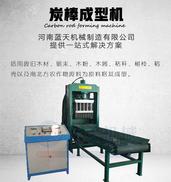藍天機械生產的炭棒成型機采用液壓成型技術,上下同時施壓,上壓120T,下頂120T,因液壓炭棒成型機做出來的成品密度非常大,廣泛受到餐廳、燒烤、取暖等行業的青睞,咨詢炭棒成型機廠家請認準“藍天”!